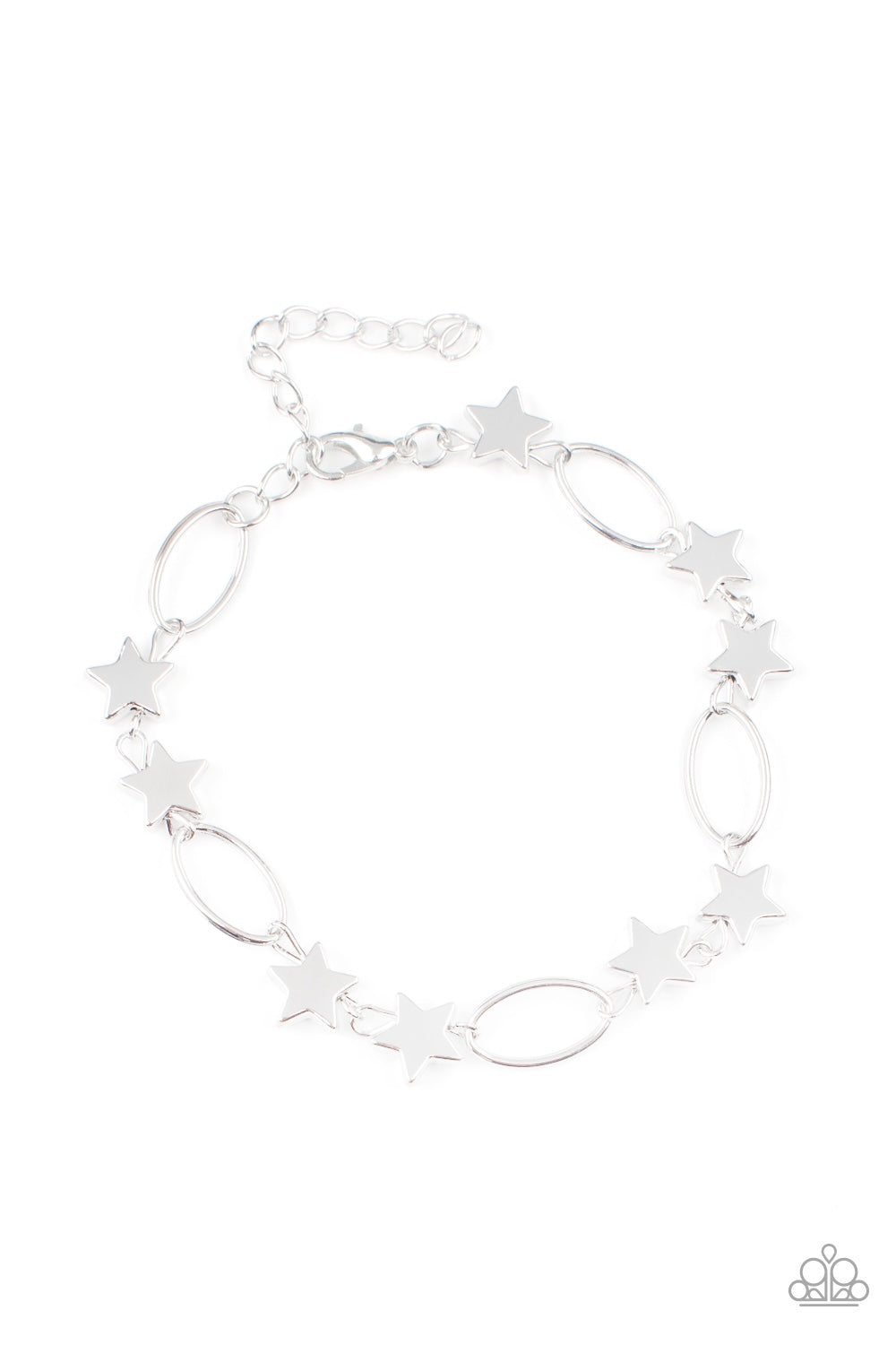 Dainty silver stars and airy silver ovals delicately link around the wrist, creating a stellar 4th of July display. Features an adjustable clasp closure. Item #P9WH-SVXX-233XX