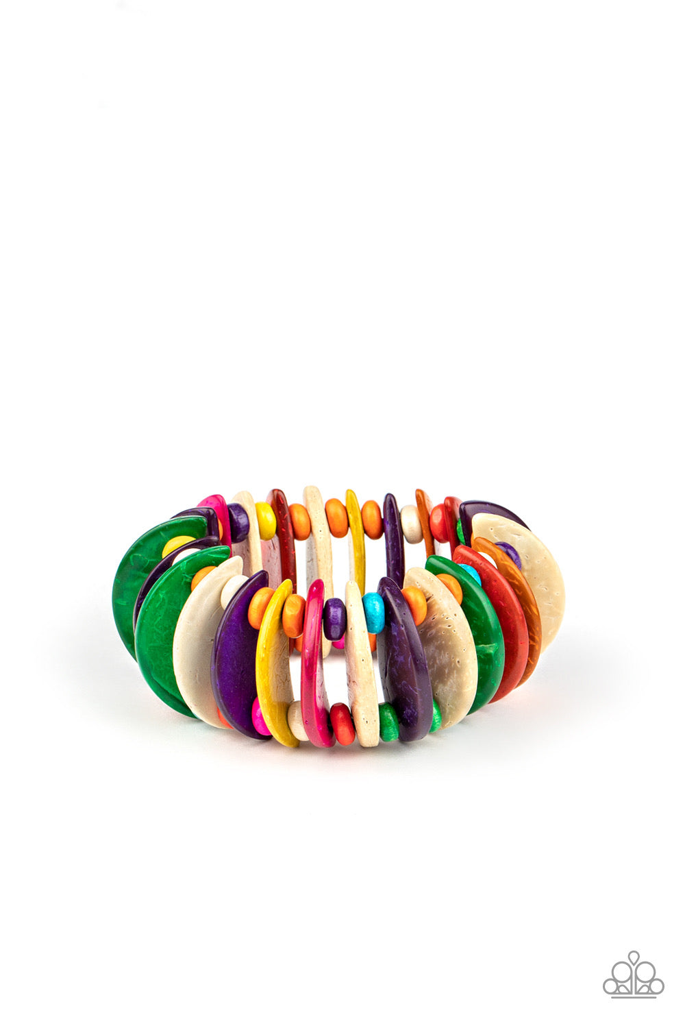 Infused with multicolored wooden beads, distressed multicolored wooden crescents are threaded along stretchy bands around the wrist for a summery look.