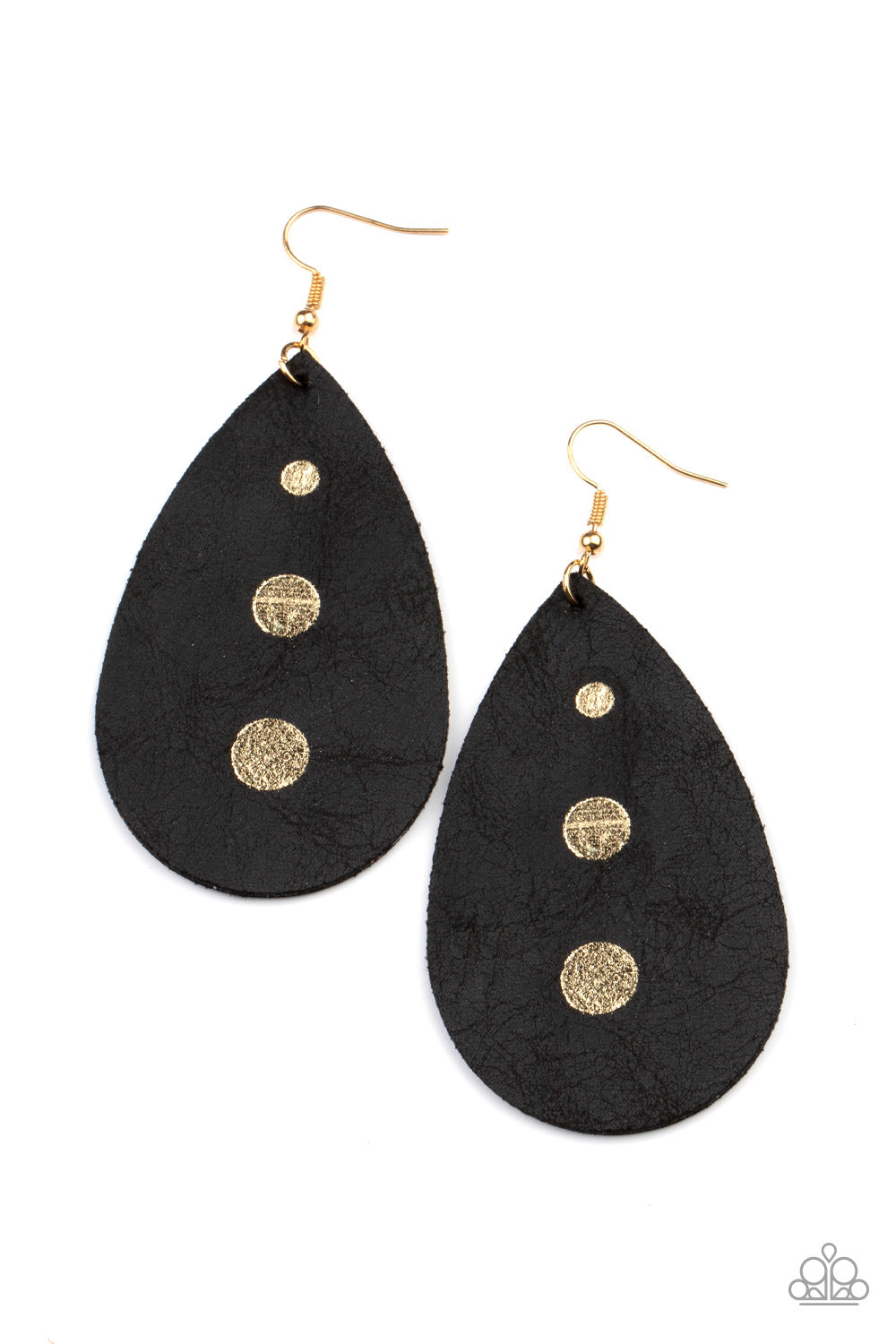 The front of a distressed leather teardrop frame is adorned with three shimmery gold paint drops, creating a rustic elegance. Earring attaches to a standard fishhook fitting.
